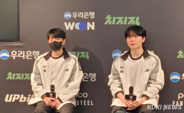 왼쪽부터 고동빈 KT 롤스터 감독과 ‘비디디’ 곽보성이 14일 서울 종로구 치지직 롤파크에 위치한 LCK 아레나에서 열린 DN 수퍼스와의 ‘2026 LCK컵’ 경기가 끝난 뒤 기자회견에 참석하고 있다. 송한석 기자