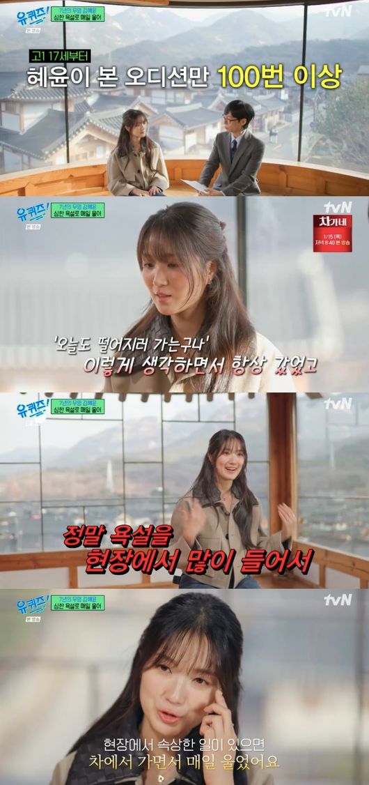 그러면서 김혜윤은 “다양해서 혼이 났다. 방송에서 나올 수 없는 말도 있었다. 정말 욕설을 많이 들었다. 현장에서 속상한 일이 있거나 촬영장에서 욕 먹을 때면 버스나 지하철에서 울었다”라고 힘들었던 시절을 회상했다.