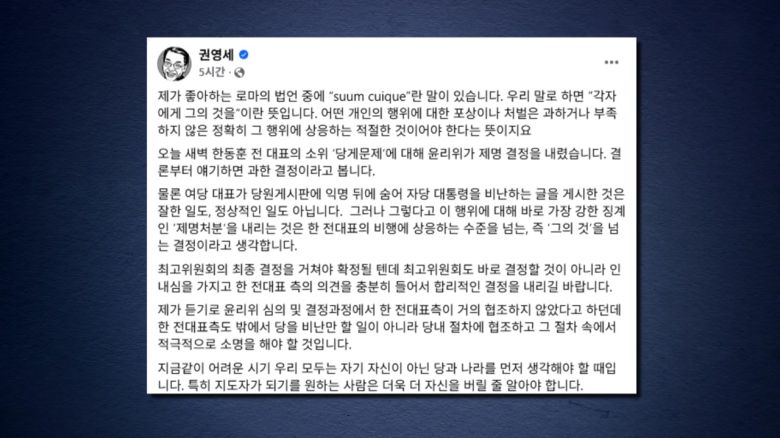 5선 권영세 의원은 어제(14일) SNS에 제명 처분은 한 전 대표의 비행에 상응하는 수준을 넘는 결정인 만큼, 최고위원회가 열리면 합리적인 결정을 내리길 바란다고 밝혔습니다.