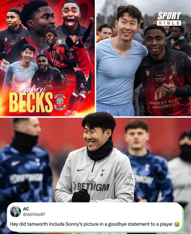 영국 '스포츠 바이블'은 13일(한국시간) SNS를 통해 "탬워스는 벡-레이 에노루의 노츠 카운티 이적을 알리는 작별 게시물에 손흥민과 함께 찍은 사진을 포함했다. 이 사진은 지난해 FA컵에서 비리그 팀 탬워스가 토트넘과 맞붙었을 당시 촬영된 것이다. 과거 자라(Zara) 매장에서 일하던 직원이었던 에노루에게는 평생 잊지 못할 순간으로 남게 됐다"라고 보도했다.