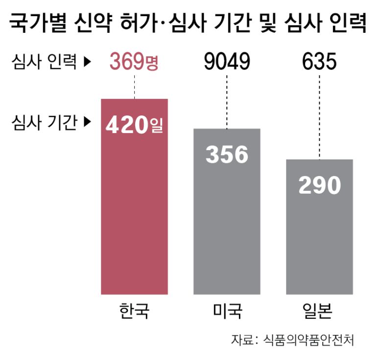 반면 미국 식품의약국(FDA)의 신약 허가 심사 기간은 평균 356일, 일본 의약품·의료기기종합기구(PMDA)는 평균 290일로 한국보다 4개월가량 빠르다. 이 때문에 낡은 허가 심사 절차가 신약 도입 속도를 늦추고 국내 바이오산업의 경쟁력을 떨어뜨린다는 지적이 이어졌다.