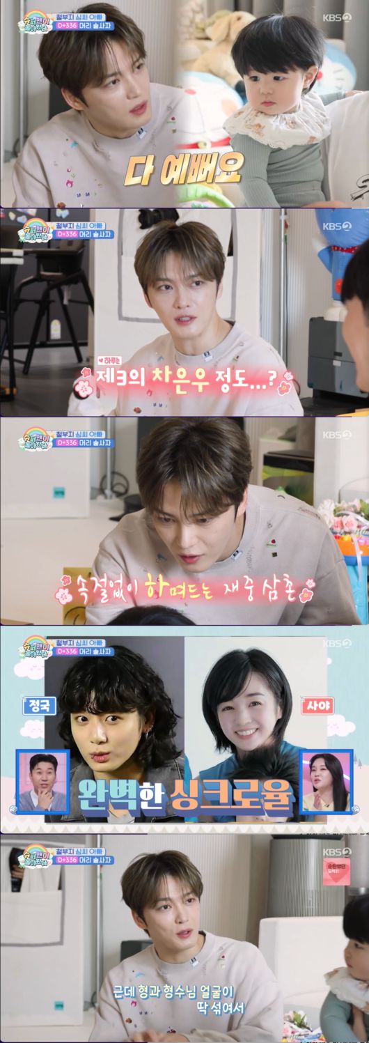 특히 김재중은 하루의 독보적인 비주얼에 대해 “형수님(사야)이 약간 정국 씨를 닮았지 않나. 형과 형수님의 얼굴이 딱 섞여서 약간 ‘제3의 차은우’ 쯤 되지 않을까 싶다”며 극찬을 쏟아냈다. 또한 김재중은 11개월 아기라고는 믿기지 않는 하루의 풍성한 머리숱을 보며 “정수리가 아주 빼곡하다”며 부러움 섞인 농담을 건네기도 했다.
