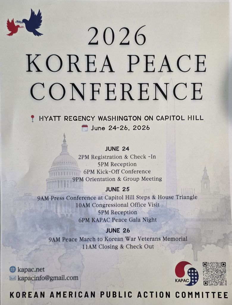 미주 한인 유권자 단체인 미주민주참여포럼(KAPAC)이 오는 6월24~26일(현지시간) 워싱턴에서 미국 연방 상·하원 의원들과 미국 거주 한인, 한국 정부 및 의회 관계자를 초청해 ‘2026 코리아 피스 콘퍼런스’를 연다고 14일 밝혔다.