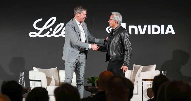 지난 12일(현지 시각) 미국 샌프란시스코에서 열린 JP모건 헬스케어 콘퍼런스에서 젠슨 황 엔비디아 최고경영자(CEO)와 데이브 릭스 일라이릴리 CEO가 대담에 앞서 악수를 하고 있다./엔비디아