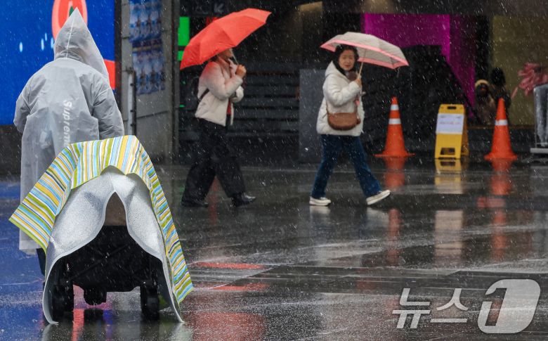 크리스마스 이브를 앞두고 진눈깨비가 내린 23일 서울 종로구 광화문광장에서 시민들이 발걸음을 재촉하고 있다. 2025.12.23/뉴스1 ⓒ News1 이호윤 기자