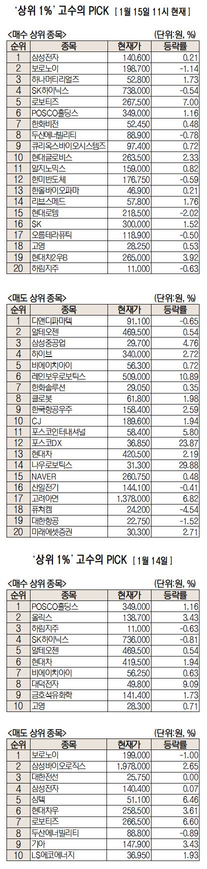 미래에셋증권에서 거래하는 고수익 투자자들이 15일 오전 가장 많이 순매수한 종목은 삼성전자(005930), 보로노이(310210), 하나머티리얼즈(166090), SK하이닉스(000660) 순으로 집계됐다.