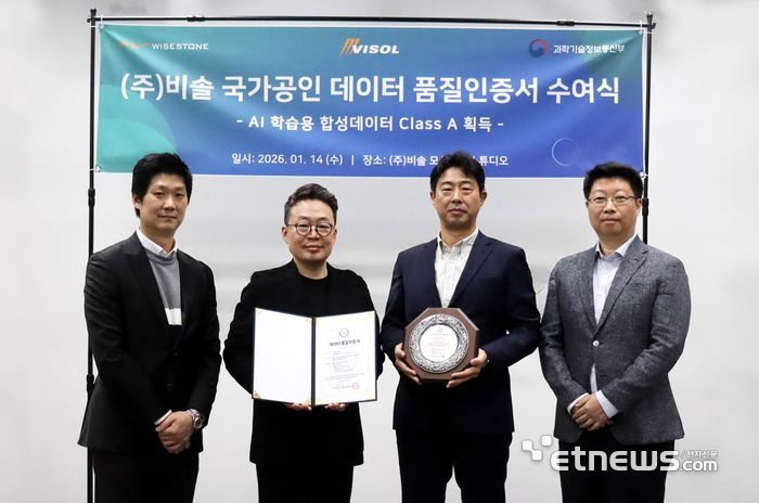국가공인 데이터 품질인증 기관 와이즈스톤(대표 이영석)은 비솔(대표 박형오)이 자체 제작한 합성 데이터에 대해 데이터 품질(DQ)인증 최고 등급인 클래스 A를 부여했다고 14일 밝혔다.