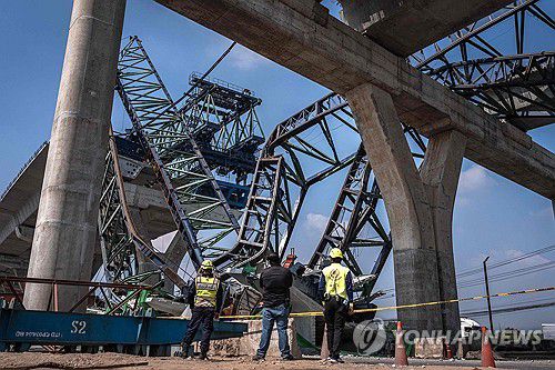 태국 방콕 인근 고가도로 건설 현장 크레인 무너져 2명 사망(방콕 AFP=연합뉴스) 15일(현지시간) 태국 방콕 인근 사뭇사콘주의 고가도로 건설 현장에서 크레인이 무너져 2명이 숨졌다.