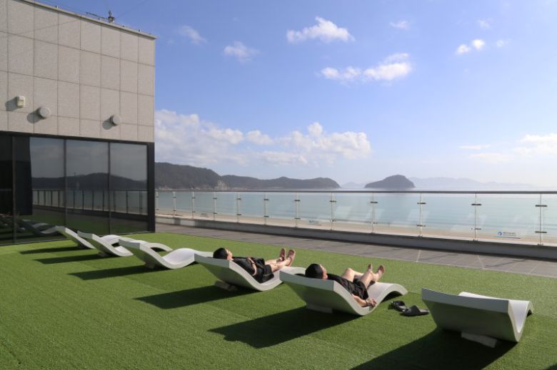다양한 해양치유 프로그램을 경험할 수 있는 전남 완도 해양치유센터를 찾은 여행객들이 남해 바다를 바라보며 휴식을 취하고 있다. 한국관광공사 제공 파크로쉬 리조트 리커버링 요가 양평 두물머리에서 마주하는 찬란한 일출 제주 WE호텔에서 진행하는 힐링 포레스트 프로그램 완도해양치유센터 명상풀 |