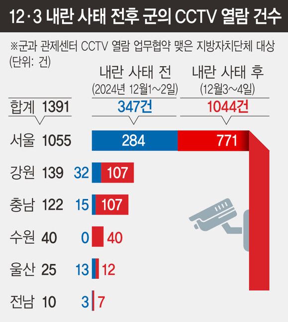 군이 12·3 비상계엄 선포 무렵인 2024년 12월3~4일 전국 주요 지방자치단체 6곳의 관제센터 폐회로티브이(CCTV) 영상을 1천회 이상 열람한 것으로 나타났다. 앞선 이틀과 견줘 세배 넘게 급증한 수치인데다 국회, 선거관리위원회, 방송사 주변 도로를 수시로 들여다본 사실이 드러나 군의 ‘계엄용 열람’이었다는 의혹이 제기되고 있다.