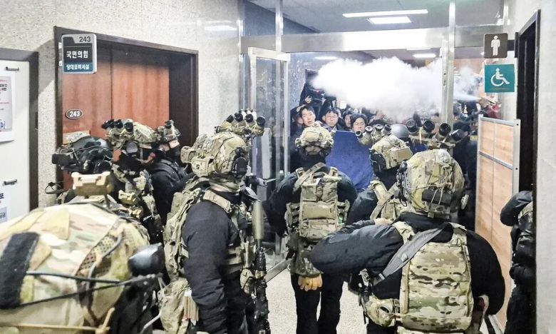 ‘내란죄 피의자’ 윤석열 대통령이 지난 2024년 12월3일 밤 비상계엄을 선포한 가운데 4일 새벽 서울 국회의사당에서 계엄군이 국회 본청으로 진입하고 있다. 연합뉴스 |