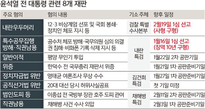 윤석열 전 대통령의 고위공직자범죄수사처(공수처) 체포방해 등 혐의 사건 1심 선고가 16일 나온다. 윤 전 대통령이 기소된 8개 사건 재판 중 법원의 첫 판단이다. 2심을 담당할 서울고법은 내란·외환 사건만을 맡을 전담재판부 2개를 다음달 23일부터 가동하기로 했다.