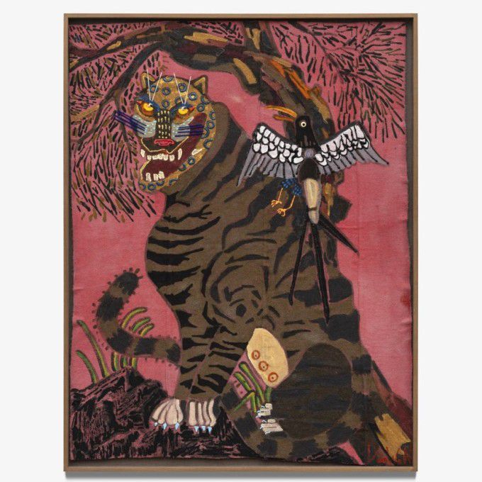 [서울=뉴스핌]이영란 미술전문기자=이두원, '소나무 아래 도깨비 호랑이와 까치'(2026). 수제 울에 먹, 아크릴, 과슈, 울실 스티치, 158.5×122.5cm. [사진=갤러리현대] 2026.01.15 art29@newspim.com