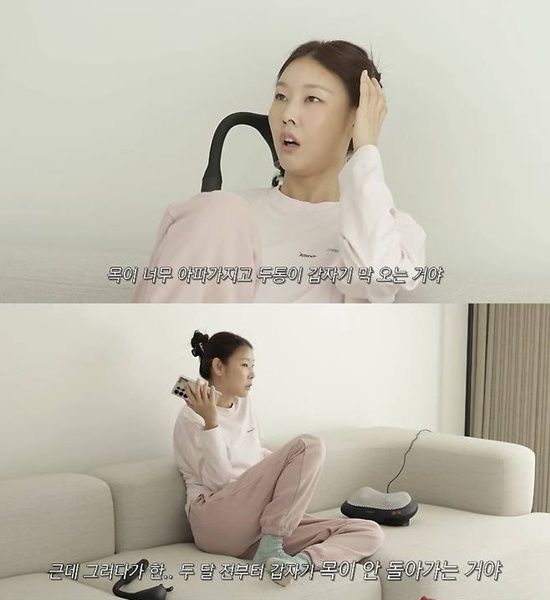 영상 속에서 한혜진은 친한 친구에게 전화를 걸어 목 통증을 호소하면서 "목이 너무 아프니 두통까지 오더라. 한 2년 동안은 만성통증으로 생각해서 참았는데, 두 달 전부터 갑자기 목이 안 돌아갔다. 나 거북목 됐다"고 말했다.