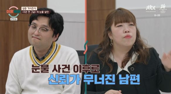 남편은 5년 전 직장암 진단을 받았고 당시 아내에게 서운했던 감정을 털어놨다. 그는 "병원에서 눈물 한방울이라도 먹으면 (수술 부위)염증이 나서 터져 죽는다고 했다"라며 아내가 지인들과 술을 마시고 자신에게 거짓말했다는 이유로 눈물을 흘렸다고 주장했다.