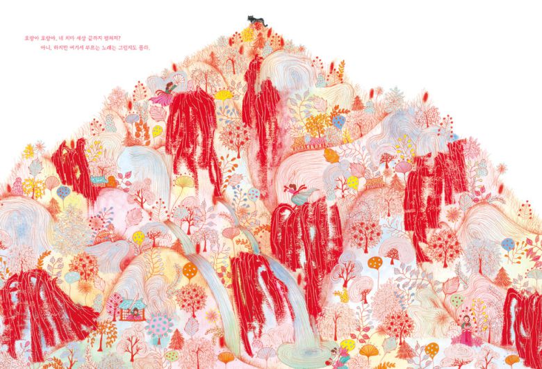 붉은색의 화려한 색감과 웅장한 화면 구성이 책 속으로 시선을 끌어들인다. “호랑아 호랑아 네 치마 세상 끝까지 펼쳐져?” 치마를 입은 작은 여자아이가 질문한다. 대답은 짧지만 단단함이 느껴진다. 호랑이가 입은 치마는 우리 옛 산수화를 연상시킨다. 한국적인 소재를 현대적인 감각으로 재해석해 깊이 있는 아름다움을 보여준다.
