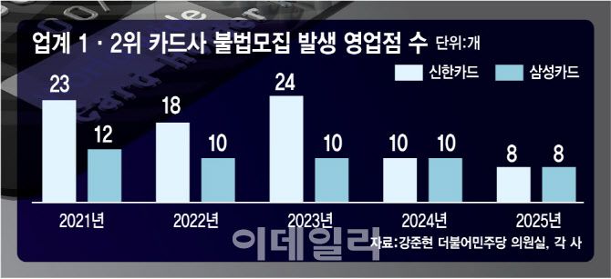 15일 국회 정무위원회 강준현 더불어민주당 의원실에 따르면 최근 5년간 4개 주요 카드사에서 불법 회원 모집이 적발된 영업점은 총 162곳(신한 83곳·삼성 50곳·우리 25곳·하나 4곳)에 이른다.