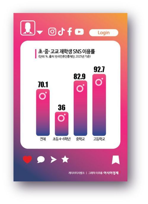 한국언론진흥재단의 '10대 청소년 미디어 이용 조사'에 따르면 지난해 기준 전국 초등 4~6학년 및 중·고교 재학 청소년 2674명 가운데 70.1%가 SNS를 이용한다고 답했다. 이전 조사인 2016년에는 66%, 2019년은 64.7%, 2022년은 78.1%를 각각 기록했다. 학급이 올라갈수록 SNS 이용률은 높아진다. 초등 4~6학년은 36%가 SNS를 이용한다고 답한 반면, 중학생은 82.9%, 고등학생은 92.7%에 달했다. 중학생 62.3%, 고등학생 69.3%는 매일 SNS를 한다.