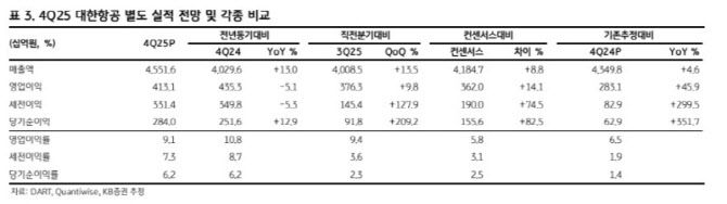 KB증권은 대한항공의 2026년 및 2027년 영업이익 전망치도 각각 기존 전망 대비 5.3%, 6.3% 상향했다. 2026년 대한항공의 영업이익은 1조 4745억원으로 전년 대비 20.9% 증가할 것으로 예측했다.