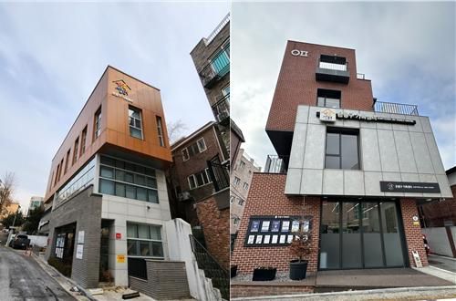 두 개의 건물이 나란히 있는 사진이다.왼쪽 건물은 나무색 외벽이고, 오른쪽 건물은 붉은 벽돌과 회색 외벽으로 되어 있다. |