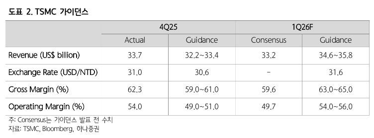 하나증권은 TSMC가 2026년 1분기에도 다시 한번 분기 기준 역대 최대 실적을 경신할 것으로 내다봤다. 회사가 제시한 1분기 매출 가이던스는 346억~358억 달러(약 46조7000억~48조3000억 원)로, 컨센서스를 웃도는 수준이다. 인공지능(AI)을 포함한 선단 공정 수요가 지속하고 있어, 미국 애리조나 팹을 비롯한 해외 생산기지의 가동률 상승이 수익성 방어에 기여할 것으로 전망했다.