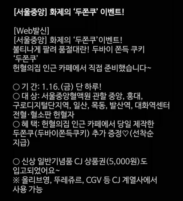 대상은 서울중앙혈액원 관할 중앙, 홍대, 구로디지털단지역, 일산, 목동, 발산역, 대화역센터에서 전혈 또는 혈소판 헌혈을 한 사람이다. 헌혈의집 인근 카페에서 당일 제작한 쿠키를 제공한다. 단 선착순으로 지급된다.