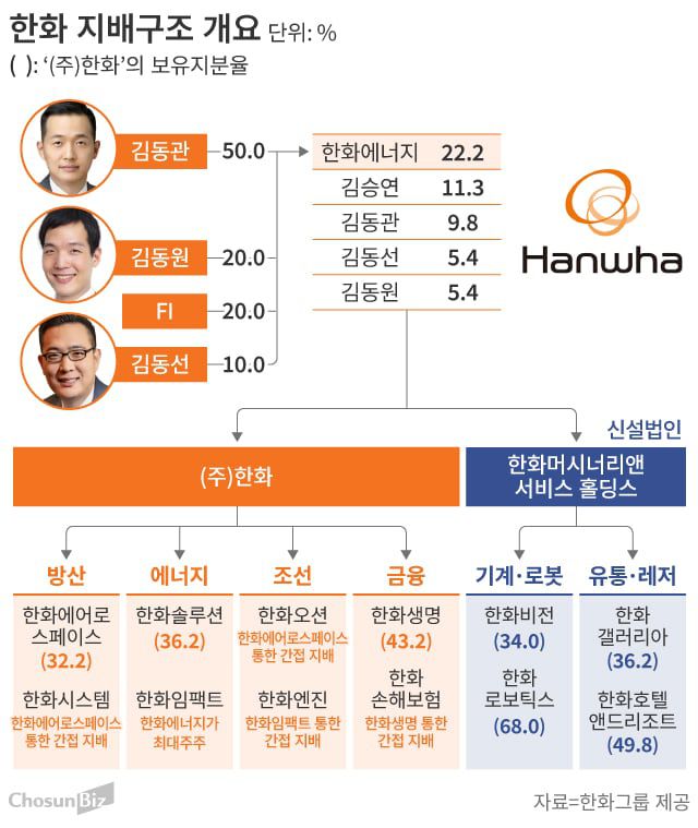 ◇ 김동관(방산·에너지·조선), 김동원(금융), 김동선(기계·로봇·유통) 구도