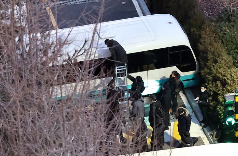 2025년 1월15일, 윤석열 대통령 2차 체포영장 집행에 나선 고위공직자범죄수사처(공수처)와 경찰이 서울 한남동 관저 입구에서 차벽을 넘기 위해 사다리를 설치하고 있다. 이날 윤 대통령은 이들과 5시간여 대치한 끝에 결국 체포돼 공수처로 압송됐다. 연합뉴스