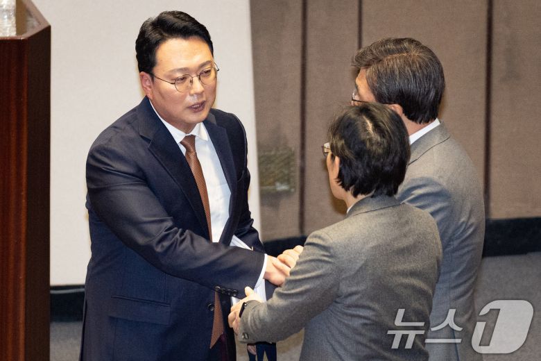 천하람 개혁신당 원내대표가 16일 서울 여의도 국회에서 열린 제431회 국회(임시회) 제1차 본회의에서 윤석열·김건희에 의한 내란·외환 및 국정농단 행위의 진상규명을 위한 특별검사 임명 등에 관한 법률안(2차 종합 특검)에 대한 무제한 토론(필리버스터)을 마친 후 국민의힘 김대식, 조지연 의원과 인사하고 있다. 2026.1.16/뉴스1 ⓒ News1 유승관 기자