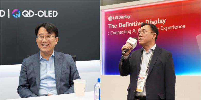 이청 삼성디스플레이 사장(왼쪽)과 정철동 LG디스플레이 사장이 이달 초 미국 라스베이거스에서 열린 세계 최대 IT 전시회 ‘CES 2026’에서 기자들과 만나 질문에 답변하고 있다./각 사
