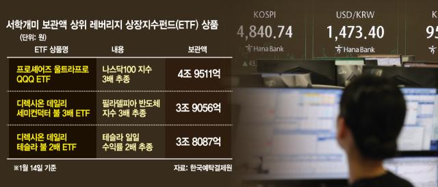 시장에서는 국내에서 거래가 제한적인 단일 종목 레버리지 ETF나 지수 3배 추종 상품이 해외 투자 수요를 자극하는 핵심 요인으로 작용하고 있다는 분석이 제기된다. 14일 기준 나스닥100지수를 3배로 추종하는 ETF의 국내 투자자 보관 금액은 33억 5966만 달러(약 4조 9511억 원)로 집계됐다. 테슬라 일일 수익률을 2배 추종하는 ETF는 25억 8470만 달러(약 3조 8087억 원), 필라델피아반도체지수를 3배 추종하는 ETF는 26억 5042만 달러(약 3조 9056억 원)에 달했다.