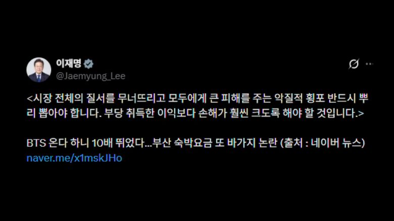 이 대통령은 오늘(16일) SNS에, 오는 6월 BTS의 부산 공연을 앞두고 부산 전역 숙박업소에 '바가지 요금' 논란이 불거졌다는 내용의 기사를 공유하며 이같이 적었습니다.