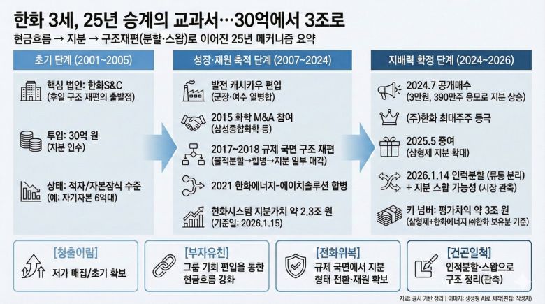 한화그룹 3세가 지난 2001년 시작해 25년에 걸친 진행한 지배구조 변천 과정은 대한민국 대기업 경영권 승계의 교과서라 할 만하다. * 기사 내용 바탕으로 제미나이가 생성함. |