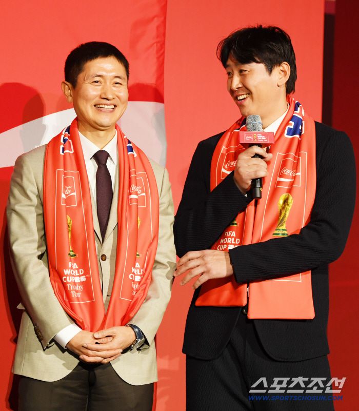 FIFA 월드컵 트로피 투어 미디어 간담회가 16일 서울 용산구 한강로동 CGV용산아이파크몰에서 열렸다. 이영표, 구자철이 포토타임을 갖고 있다. 용산=박재만 기자 pjm@sportschosun.com/2026.01.16/ |