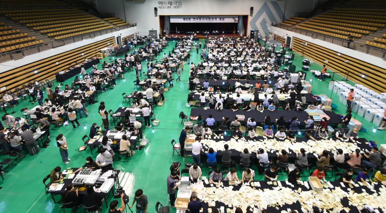 제8회 전국동시지방선거 투표일인 2022년 6월 1일 오후 경기 수원시 영통구 아주대학교 체육관에 마련된 개표소에서 개표사무원들이 개표를 하고 있다./뉴스1 |