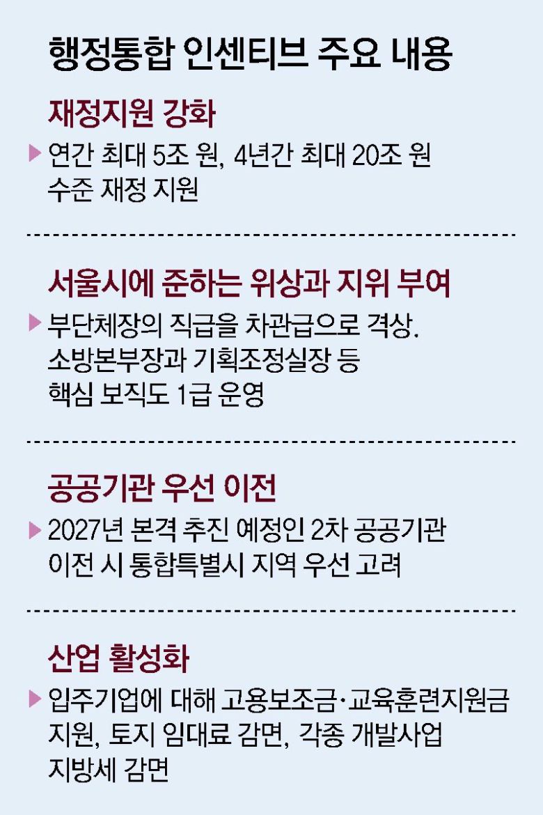 정부가 16일 연간 최대 5조 원 재정 지원, 서울특별시에 준하는 대우, 공공기관 이전 우대 등 통합 특별시에 대한 다양한 인센티브를 제시한 것은 올해 핵심 국정과제인 ‘지방 주도 성장’을 위해 행정통합이 차질 없이 진행돼야 한다는 판단 때문이다. 정치권에서 대전·충남, 광주·전남의 통합 지방자치단체장을 6·3 지방선거에서 선출하는 방안이 가시화되는 가운데 정부의 인센티브 발표로 통합 논의에 더욱 속도가 붙을 것이란 전망도 나온다. 국민의힘은 이날 정부 발표에 대해 “정치적인 표 계산을 먼저 생각한 것 아니냐”며 “6·3 지방선거용”이라고 비판했지만 행정통합 의제를 먼저 제안했던 만큼 적극적으로 반대하지는 못하는 분위기다.