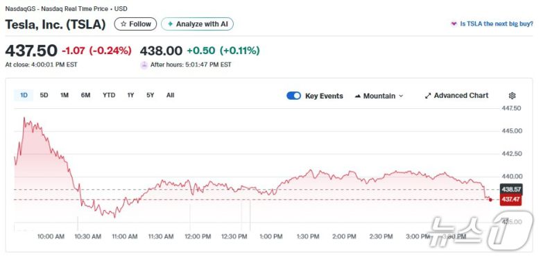 16일(현지 시각) 뉴욕증시에서 테슬라는 0.24% 하락한 437.50달러를 기록했다.