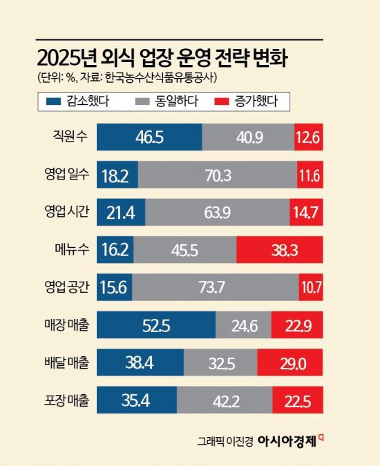 17일 한국농수산식품유통공사(aT)의 '2025 국내외 외식 트렌드'에 따르면 외식업체 운영 변화에서 가장 먼저 드러난 것은 인력이다. 지난해 전년 대비 직원 수를 줄였다는 응답이 46.5%에 달했지만 늘렸다는 비율은 12.6%에 불과했다. 외식업체 두 곳 중 한 곳이 인력을 줄이며 비용 구조를 재편하고 있다는 뜻이다.