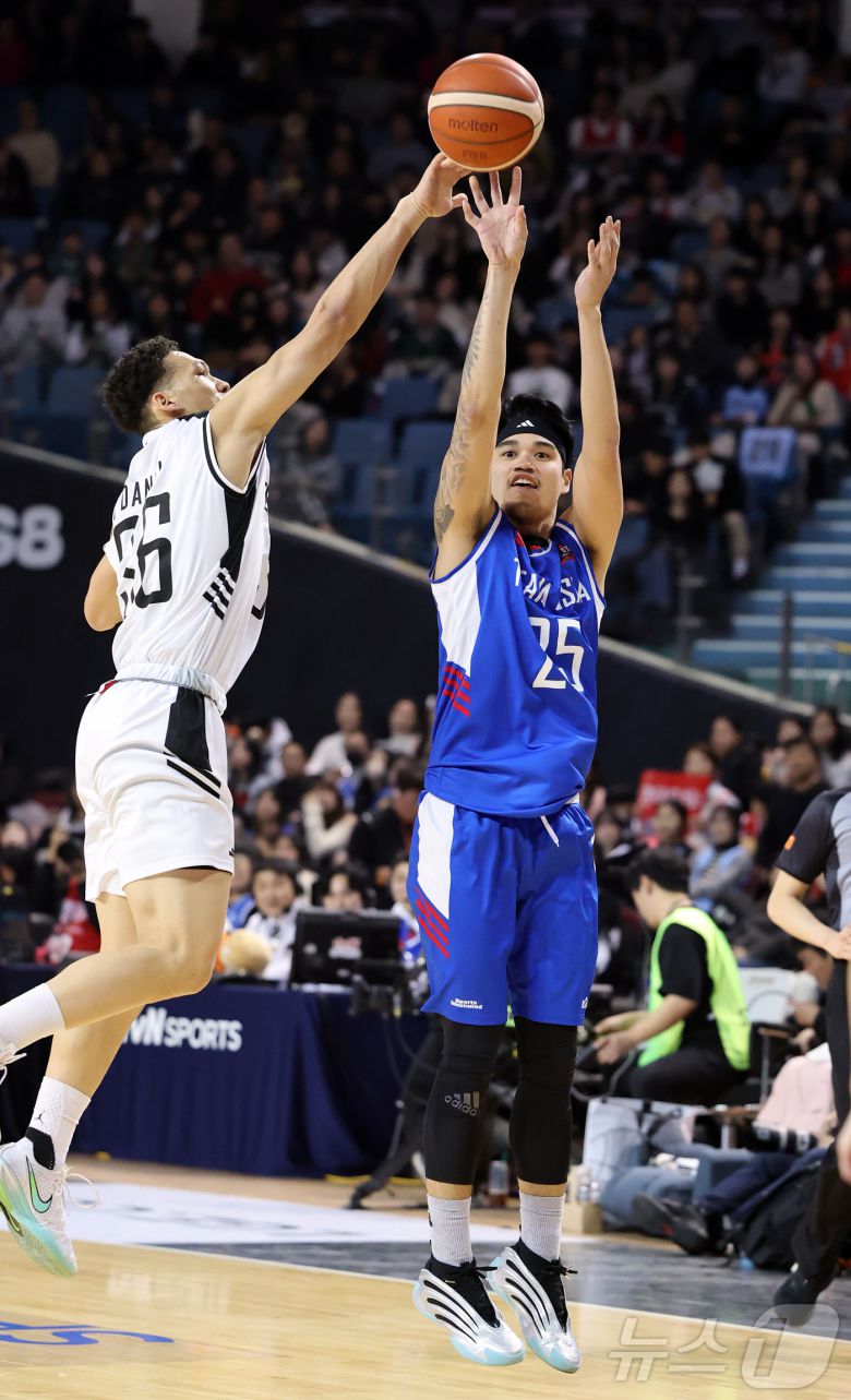 17일 오후 서울 송파구 잠실실내체육관에서 열린 2025-2026 LG전자 프로농구 올스타전 전야제 팀 아시아와 팀 루키의 경기, 팀 아시아 케빈 켐바오가 인 유어 페이스를 성공시키고 있다. 이번 올스타전은 지난 2015-2016시즌 이후 10년 만에 잠실실내체육관에서 열리는 경기이자, 해당 체육관 철거 전 마지막으로 열리는 올스타전이다. 2026.1.17/뉴스1 ⓒ News1 김진환 기자 |