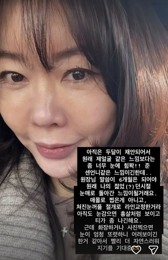 또한 수술 후 경과에 대해서는 "아직 두 달이 채 안 돼서 원래 얼굴이라기보다는 눈에 힘을 빡 준 센 언니 같은 느낌"이라며 "원장님이 6개월은 지나야 젊었을 때 눈매로 돌아온 느낌이 날 거라고 하더라"고 전했다.