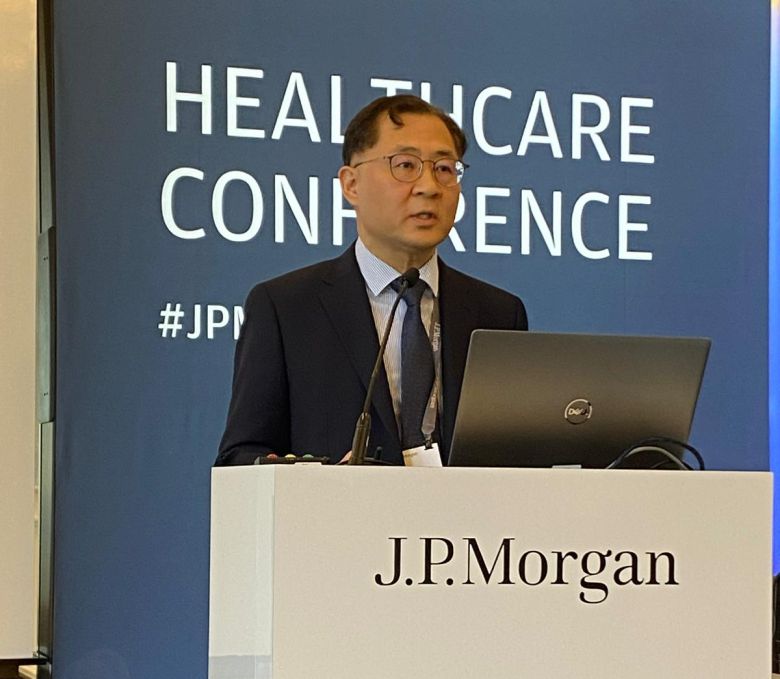 전태연 알테오젠 사장이 15일(현지시간) 미국 샌프란시스코에서 열린 ‘제44회 JP모건 헬스케어 콘퍼런스’ 아시아태평양(APAC) 트랙에서 발표하고 있다. [알테오젠 제공]