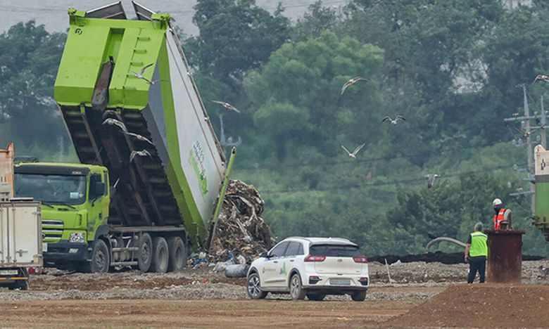 인천 서구 수도권매립지 제3-1매립장으로 생활폐기물 운반차량이 폐기물을 쏟아내고 있다. 최상수 기자