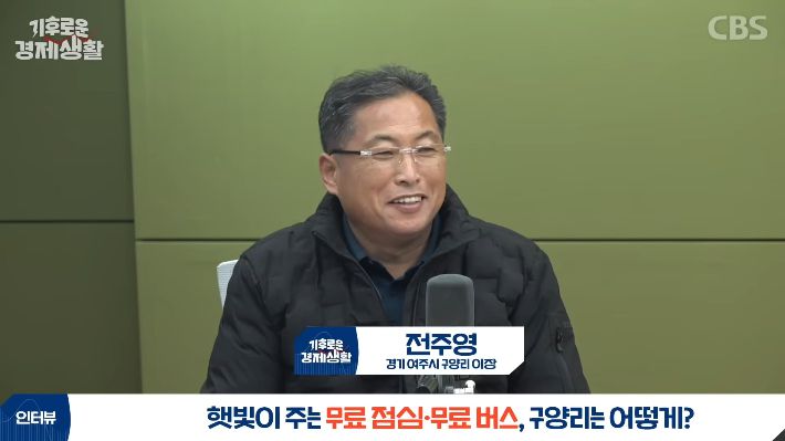 ◆ 홍종호> 안녕하세요. CBS 경제연구실입니다. 저는 기후의 눈으로 경제를 읽는 기후로운 경제생활 홍종호입니다. 경기도 여주시에는 매달 태양광 발전으로 1천만 원을 벌어 무료 점심과 무료 버스를 운영하는 마을이 있습니다. 정부에서도 주목한 햇빛 소득 마을 구양리인데요. 처음엔 내가 20년은 더 살겠나, 라며 태양광 설치를 반대하던 주민들께서도 지금은 한 식구가 되었다고 합니다. 오늘은 구양리의 마을 태양광 사업을 이끌어 오신 전주영 이장님에게 햇빛이 농촌을 살리는 비법 직접 들어보겠습니다. 그럼, 잠시 후에 뵙겠습니다.