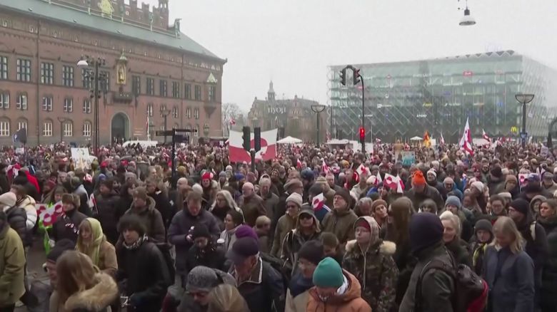 현지 시간 17일 낮 12시 코펜하겐 시청 앞에 모인 시민 수천 명은 덴마크령 그린란드를 접수하려는 트럼프 대통령의 시도에 강력히 항의했습니다.