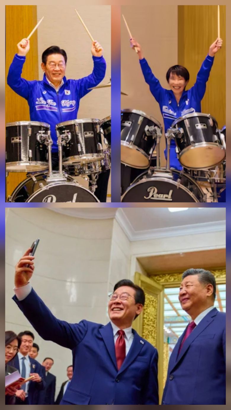 이재명 대통령이 새해 벽두에 대만 문제로 갈등이 커져가는 중국과 일본을 연쇄 방문해 환대받은 것은 한국의 지정학적 가치를 일깨우며 같은 진보 정부인 문재인 정부와 비교된다는 평가가 나오고 있다. 윗 사진은 지난 13일 이 대통령이 다카이치 총리와 함께 드럼을 치며 화합을 다지는 모습이다. 아래 사진은 지난 5일 베이징 인민 대회당에서 시진핑 중국 주석과 함께 샤오미 스마트폰으로 셀카를 찍고 있는 장면이다./이재명 대통령 X 캡처