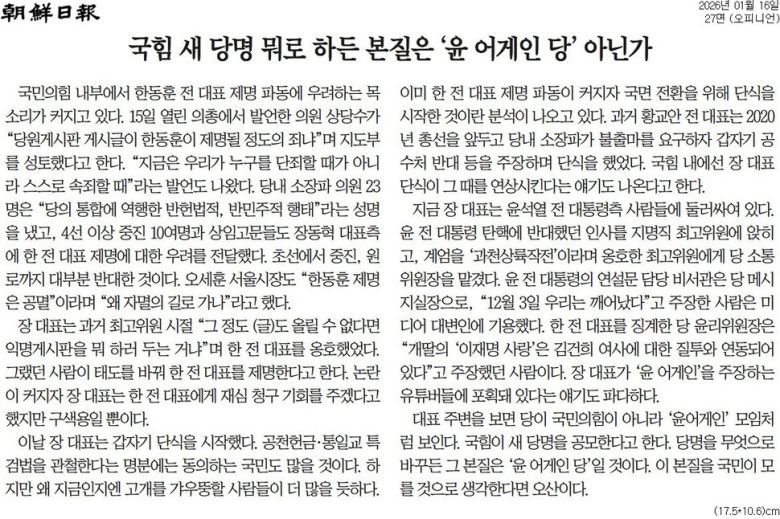 조선일보는 1월16일 치 신문에 “국힘 새 당명 뭐로 하든 본질은 ‘윤 어게인 당’ 아닌가”라는 제목의 사설을 실었습니다. 제목이 하도 강렬해서 어느 신문인지 다시 한 번 확인하고 내용을 읽었습니다.