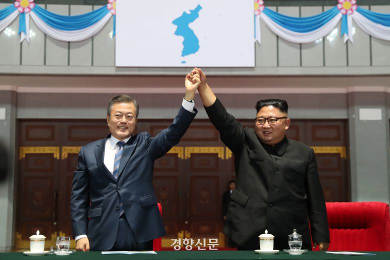 2018년 9월19일 당시 문재인 대통령과 김정은 북한 국무위원장이 평양 5.1 경기장에서 열린 ‘빛나는 조국’ 공연에 손을 들어 인사하고 있다. 평양사진공동취재단·서성일 기자 |