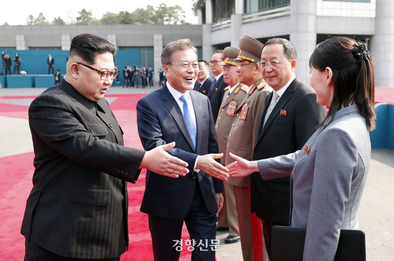 2018년 4월27일 당시 문재인 대통령이 김정은 북한 국무위원장의 소개로 판문점에서 김여정 노동당 부부장과 악수하고 있다. 판문점 | 한국공동사진기자단·서성일 기자