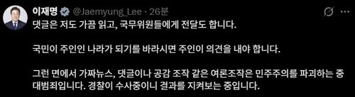 이 대통령은 지난달 30일 국무회의에서도 댓글 순위 조작을 두고 "업무방해일 뿐 아니라 정보 조작으로, 민주주의 체제를 위협하는 행위"라며 행정안전부와 법무부에 점검을 지시한 바 있습니다.