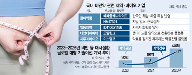 국내 기업들도 차별화된 기술력을 앞세워 틈새시장을 공략하고 있다. 한미약품(128940)은 국내 1호 비만 치료제 '에페글레나타이드'를 올 하반기 출시한다. 한국인의 체형·체중 특성을 반영한 GLP-1 수용체 작용제로, 위고비 등 글로벌 약물과 유사한 감량 효과를 내면서도 부작용을 최소화했다. 평택 공장에서 생산해 가격 경쟁력을 확보한 것도 강점이다. 권해순 유진투자증권 연구원은 "가격 경쟁력과 국내 임상 특화, 낮은 부작용 등 마케팅 전략이 상업화 성공의 핵심"이라고 내다봤다.